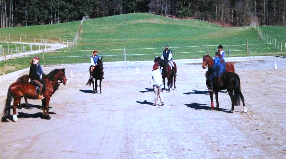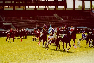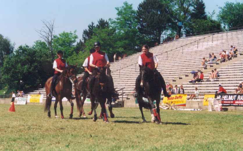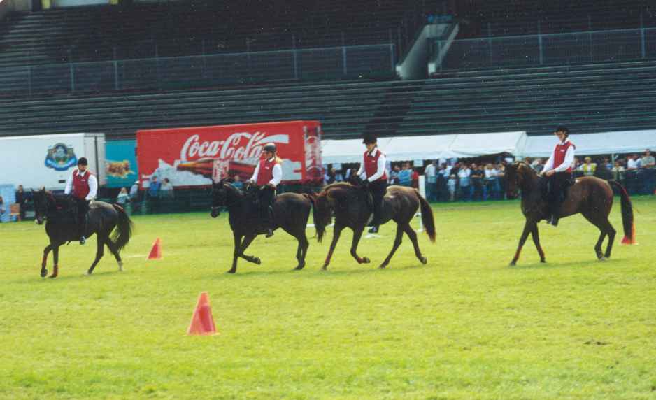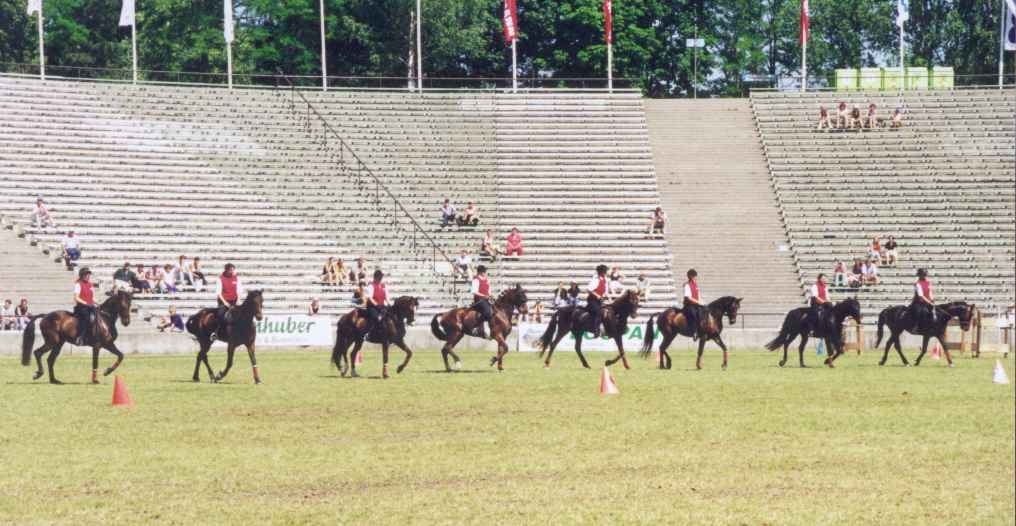 Jetzt hatten wir also unseren ersten großen Auftritt, auf der Messe "Pferd International" in München-Riem im Showprogramm. Wir maschierten in großer Formation in das Stadion ein und zeigten dann die Traberquadrille, für die wir so lange geübt hatten . Derweil fuhren die Traber in den Sulkys außen herum. Dann ritten wir alle noch über ein paar Hindernisse: Sprung, Brücke, Plane, Stangen... und verabschiedeten uns mit einer Ehrenrunde im fetzigen Galopp. So ein Stadion hat schon was !